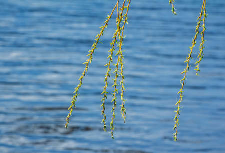Branches of white willow on a background of water on a sunny spring day.