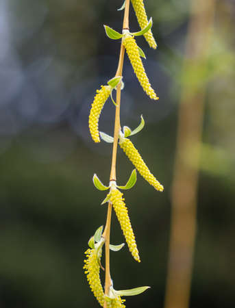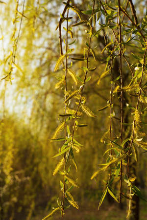 Hanging flowering branches of a weeping willow with young leaves and catkins in spring. Background.