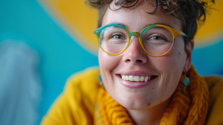 A woman with glasses smiling and wearing a yellow sweater, AI