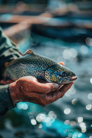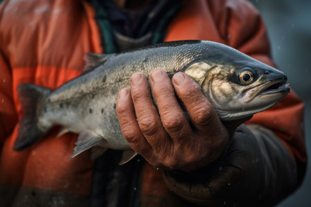 This captivating image presents a close-up view of a fisherman's hand gently cradling a fish. The composition focuses on the intimate connection between the fisherman and his catch, capturing the essence of the fishing experience. The detail-rich image showcases the rough textures and calloused skin of the fisherman's hand, highlighting the dedication and skill involved in the art of fishing. Witness the tangible result of the fisherman's labor as he holds the fruit of his efforts, symbolizing the harmony between humans and the bounties of the sea.