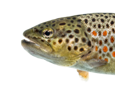 Close-up of head of brown trout, isolated on white