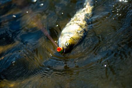 Good day for fishing. fishing on lake. Good catch. fish on hook. stalemate and hopelessness. fly fishing trout. recreation and leisure. trout bait. catch fish. fall into trap. hobby sport activity