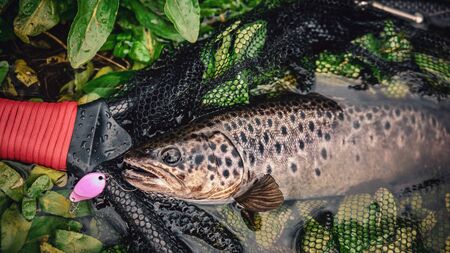 A beautiful brown trout is caught spinning.