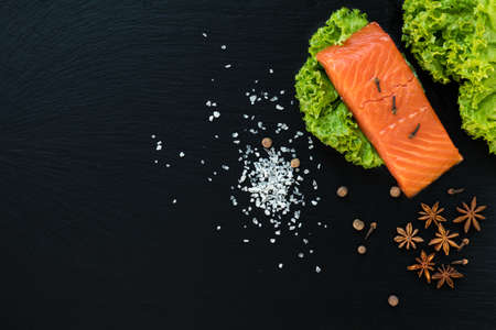 Preparing fresh seafood in the kitchen with gourmet salmon fillet surrounded by fresh herbs and spices on black stone background