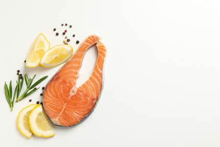 Salmon Fish..Raw salmon fillet pepper salt dill lemon rosemary on wooden table.