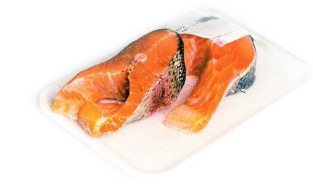 Fresh delicious fish cut into pieces. Delicate salmon steak on white ice