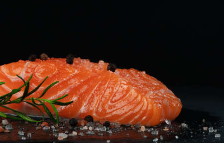 Fresh raw salmon fillet with seasonings and herbs, close-up on black background.