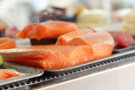 Frozen sea sliced red in ice on a counter in a store during the sale of fresh and wholesome products.
