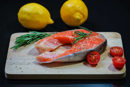 Grilled salmon steak on vintage wooden board with fork, olive oil, vegetables, herbs and spices on dark concrete background. Raw salmon fillet with vegetables, spices and lemon on wooden table.
