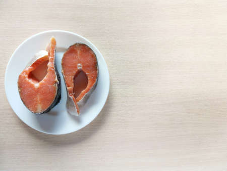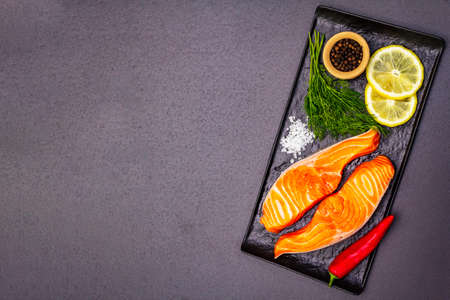 Top view of fresh raw Atlantic salmon. Great source of omega-3 fatty acids and protein. Keto diet, healthy food. copy space for recipe.