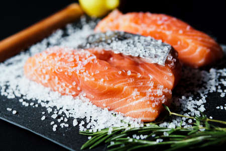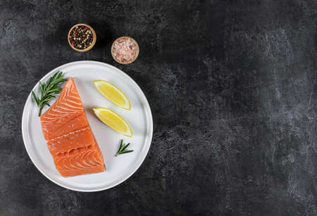 Raw salmon filet with rosemary and lime on dark slate background, wild Atlantic fish. Delicious fish meat. top view