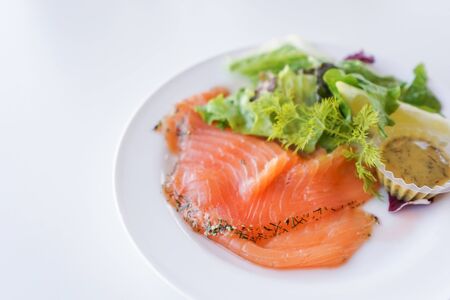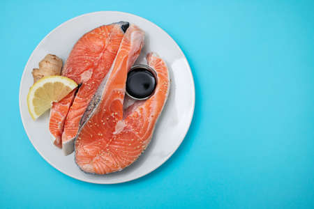 fresh salmon with lemon, ginger and soy sauce on white plate