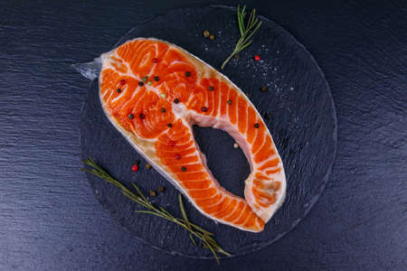 Fresh raw salmon fish steak with seasoning and vegetables on black stone