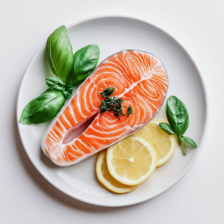 A fresh salmon steak sits on a speckled plate. It is topped with lemon slices and fresh basil leaves, creating an appealing presentation perfect for a healthy meal..