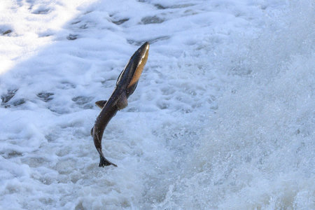 A powerful salmon defies the rushing rapids, leaping upwards during its annual upstream migration in a display of natural determination