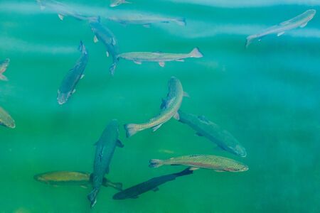 Beautiful view of salmons swimming in a crystal-clear mountain river with pure, clear water.