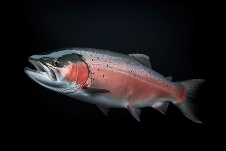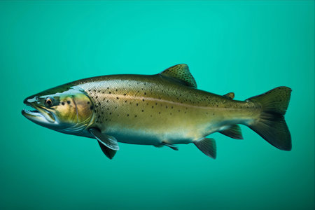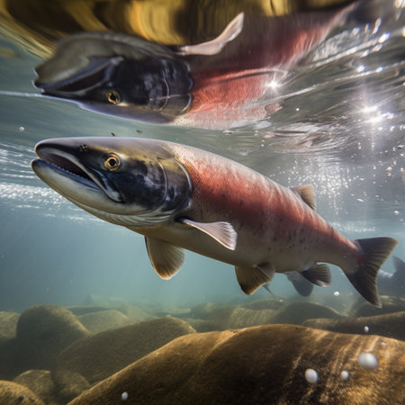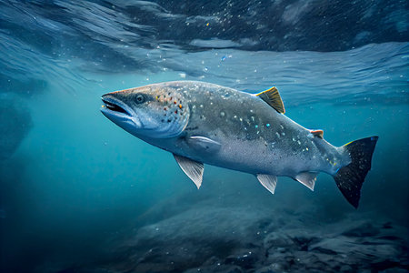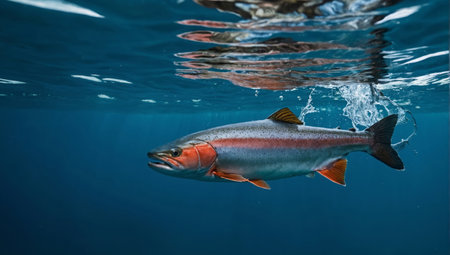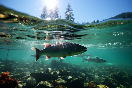 Salmon fish swimming in clear water with sunlight filtering through the surface in a natural habitat