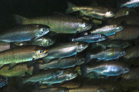 River Trout swim underwater, Trout underwater scene, Trout farm