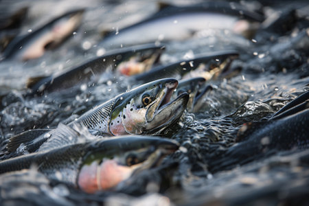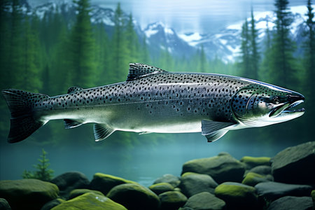 A salmon swims vigorously against the current, symbolizing strength, resilience, and perseverance. the dynamic water flow highlights the challenges faced, making it an inspiring metaphor for overcoming obstacles in nature and business.