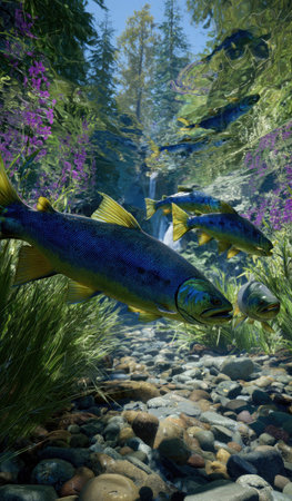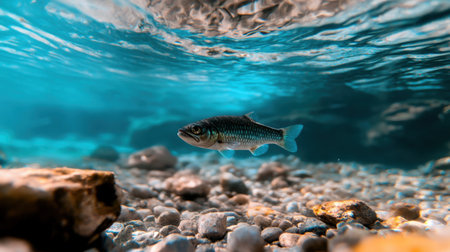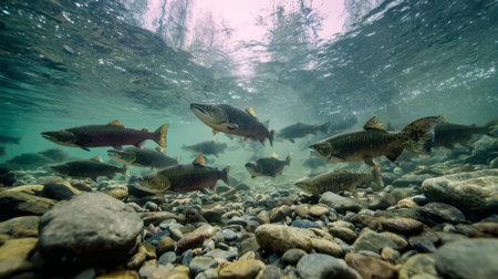 A captivating underwater view showcasing a school of salmon swimming gracefully among pebbles in a clear freshwater stream. The serene scene highlights the beauty of aquatic life and emphasizes the importance of healthy ecosystems.