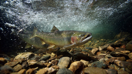 A vibrant rainbow trout glides gracefully through a crystal clear freshwater stream, showcasing its natural colors against a rocky bed and bubbles rising around it.