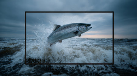 A striking image of a salmon leaping from stormy ocean waves showcases the raw power and beauty of marine life against a dramatic cloudy backdrop.