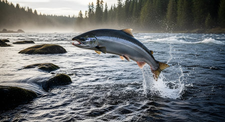 A powerful salmon is captured in mid-air, splashing water as it jumps upstream against the current of a wild, rocky river. This dynamic image of wildlife migration is set against a backdrop of a misty evergreen forest, symbolizing instinct and perseverance.