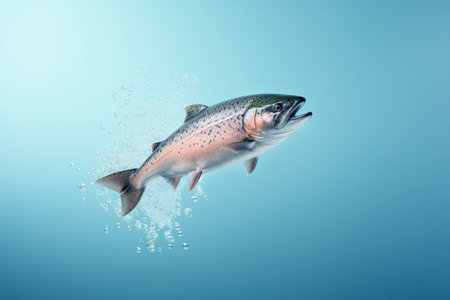 Salmon fish with water splashes isolated on light blue background. AI generated.