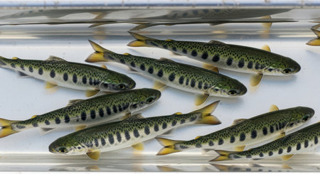 This image presents several fish swimming gracefully in a clear, flowing stream. The scene is illuminated with natural light, showcasing the fish's bright colors and the detailed underwater environment. The composition highlights the lush green vegetation. Suitable for various editorial and commercial applications related to nature and wildlife.