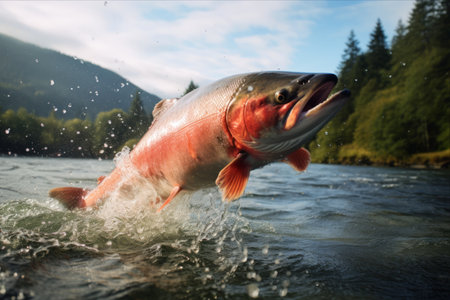 A salmon leaps energetically from the waters of a river with a dynamic splash