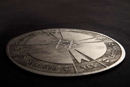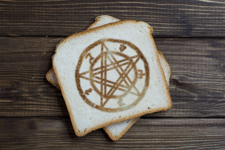 toast with the magic circle sign on dark wood. Magical runes. A ritual to summon demons.
