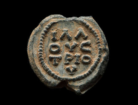 Antique post seal in patina and letters on it, isolated on black, close-up shot
