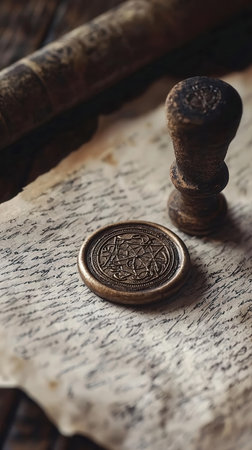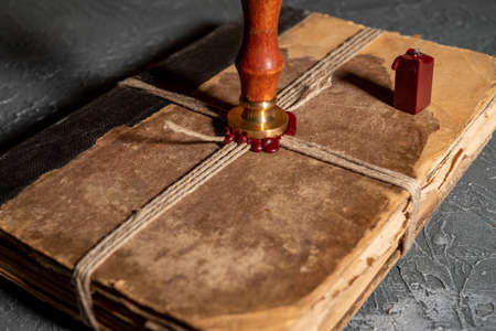 Antique shabby book tied with a thread with a wax seal and a stamp. The concept of secret knowledge