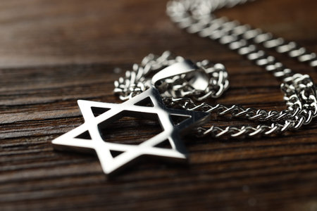 Pendant in shape of Star of David and metal chain on wooden table, closeup