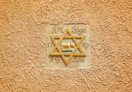 Pezenas, Herault, France - Aug 26 2017: Carved stone Star of David set into a round opening in a stone wall in the Jewish quarter of Pezenas, Languedoc, France