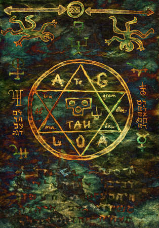 Hand drawn Halloween illustration of old page with wicca and mystic symbols from witch magic spell book. Gothic, occult and esoteric background. Only fantasy letters, no foreign language