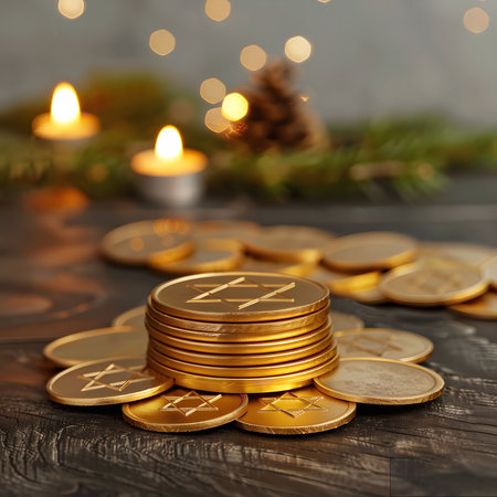 Close-up shot of golden coins with Star of David symbols stacked on a wooden table with candles in the background.
