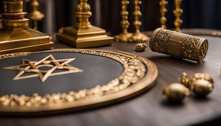 A still life photo featuring a Star of David on a golden plate surrounded by candles, an old book, and other religious artifacts. The image highlights Jewish symbolism and spiritual tradition.