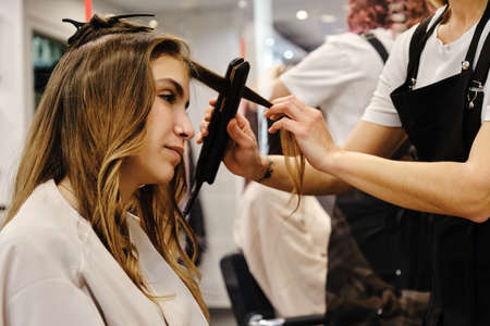 Master woman hairdresser gently curls hair curling girl in a beauty salon. Hair styling