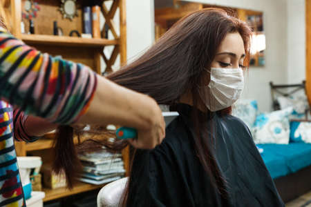 Hairdresser, protected by a mask, combing her clients hair with a hair iron in a salon.