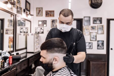 Lifestyle photo. Professional barbershop. Young man customer wears face mask. Hairdresser male hands work move comb tool electric clipper. Modern style short hair locks cut. Fashion service salon