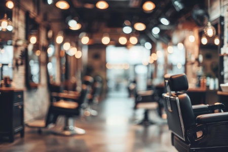 A cozy blurred barber shop background featuring tools, chairs, and styling details.