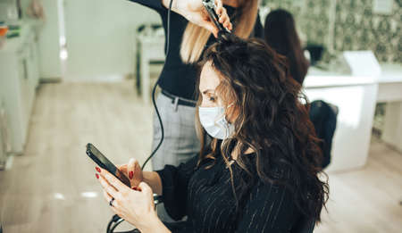Woman in medical mask gets her hair done in beauty salon during pandemic.