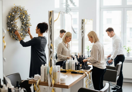 A bright and airy salon scene shows stylists attending to clients at various stations, creating a bustling and professional atmosphere.