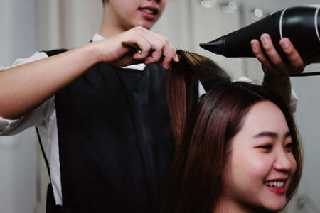 Hair salon concept a male hairdresser using a hair dryer drying a female customer’s wet hair after hair wash process.