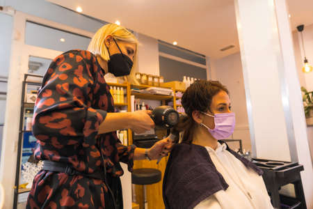 Hairdresser with security measures for the covid-19, new normality, social distance. Drying the hair of a brunette client with a mask