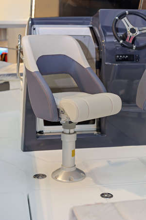 Steering wheel on the remote control ship. Steering wheel and ship throttles on the captains bridge. Modern ship control panel.