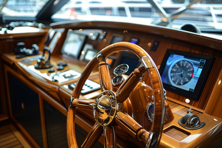 Wooden captains bridge on a white yacht with a beautiful steering wheel and folding tables
