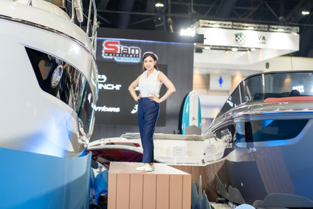Nonthaburi, Thailand - MAR 26, 2023 Unidentified model poses with a car at The 44th Bangkok international motor show 2023 at IMPACT Arena, Muang Thong Thani, Nonthaburi, Thailand.