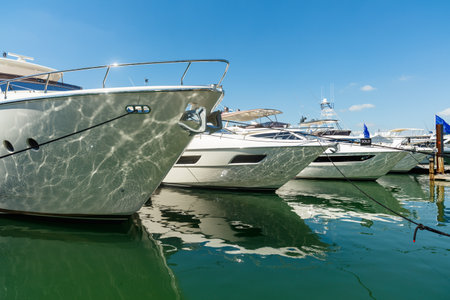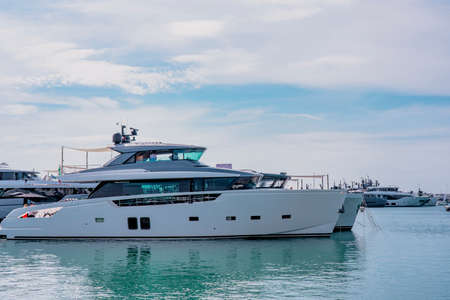 Luxury yacht in the port. The coast of the Atlantic Ocean. Rich life in Miami. Things to do in Miami Beach. Beautiful white luxury yachts for a relaxing holiday. Summer in US.
